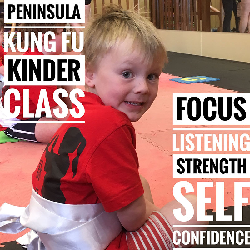Peninsula Kung Fu kinder classes are specifically aimed at preschool children. Our primary aim for all our children’s programs is to learn lifelong skills and promote attributes to be happy safe and confident.